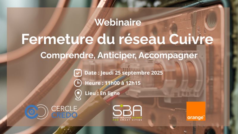 Le Cercle CREDO a contribué le 25 septembre au webinar « Fermeture du réseau Cuivre : Comprendre, Anticiper, Accompagner » organisé par la SBA – Smart Buildings Alliance for Smart Cities* avec le concours d’Orange. Plus d’une centaine de personnes y ont participé.